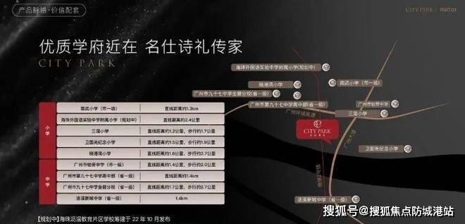 小区仅配建一所幼儿园,周边 1 公里左右有南武小学(市一级)、广州市劬劳中学(市一级)、广州市第九十七中学高中部(省一级)、洛溪新城中学 (省一级) 等学校,但具体入读需以当年教育局公布为准。现行规划显示,项目周边还规划有幼儿园、小学、九年一贯制学校等教育用地,未来教育资源有望进一步完善。