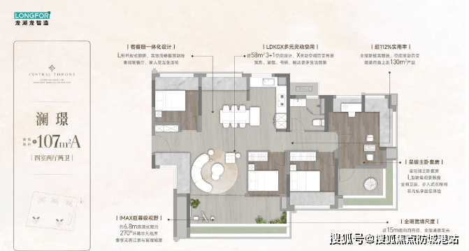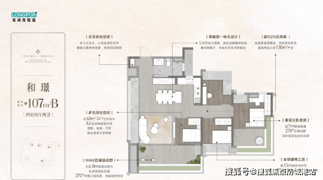 107㎡:南向面宽14.5米,首创独立阳光女神衣厅,适合改善型住户。
