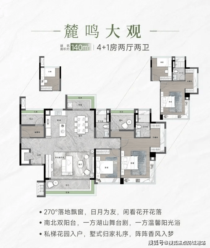 作为项目的高端户型,140㎡户型堪称“湖山观景王”。270°寰幕视野设计,推窗就能观山瞰湖揽园,每一处视角都是风景,居住体验直接拉满。约44㎡轻奢阔厅,空间开阔大气,搭配南北双阳台,通透对流,清风穿堂而过,无论是日常居住还是宴请宾客,都尽显格调。私享电梯前室设计,拓展了舒朗的生活空间,可设置鞋柜、收纳柜,增加储物能力,同时保证了居住的私密性。这款户型适合追求高端生活品质的家庭,在享受湖山低密环境的同时,拥有阔绰的居住空间,进阶轻奢生活。