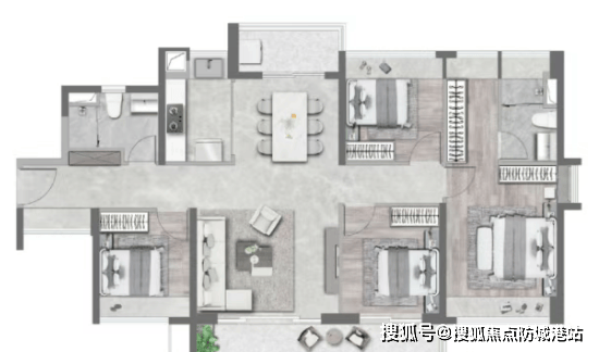 双主套设计:这是该户型最大的亮点。主卧套房面积约25㎡,配备独立衣帽间和浴缸,宽幕飘窗让人仿佛置身星级酒店。次主套的设计,完美解决了三代同堂家庭的隐私痛点,让父母或大孩子也能拥有独立的私密空间,互不打扰,其乐融融。
