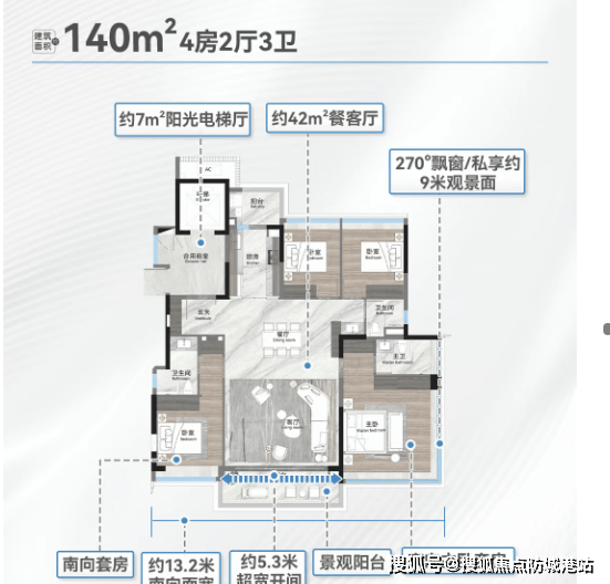 【林隐】建面约 140㎡:一梯一户板式大平层,双主套设计,全明卫,南北双阳台,通透采光,私密性强。