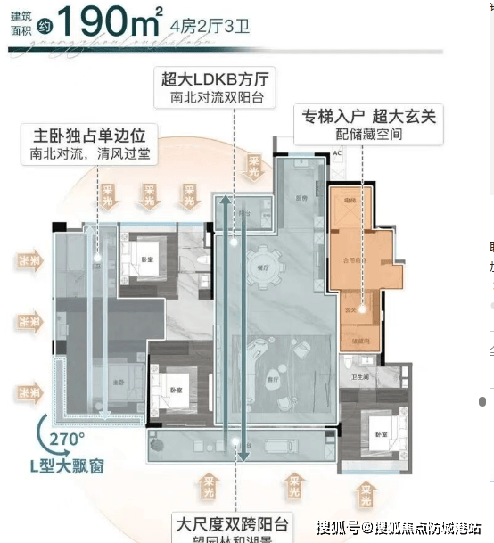 纯板楼设计,2 梯 2 户布局,户型使用率高,LDKG 一体化、270° 飘窗、双主套等豪宅设计理念,满足高端改善家庭居住需求。