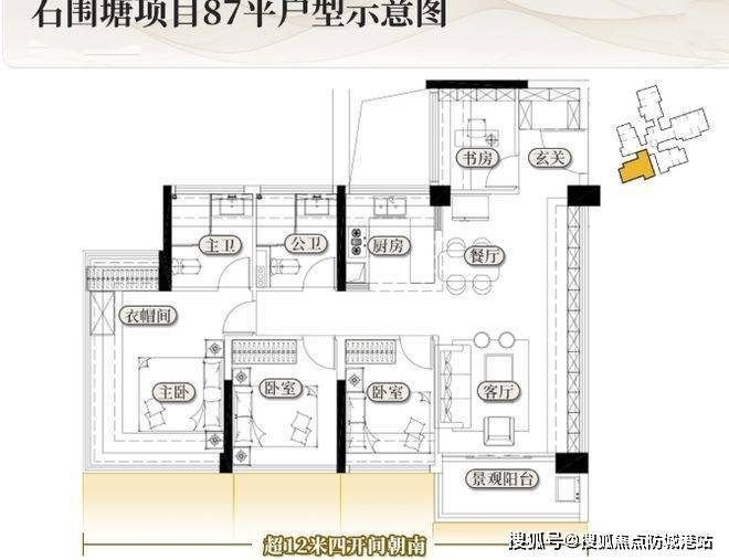 项目主打建面约 73 - 106 平的三种户型,定位刚需和首改客群。73 平户型格局相似,做到 3 房 1.5 卫,功能等同于 2 卫,主卧 270° 景观视野,为小户型带来舒适体验。87 平户型全部做到 4 房,非入户花园凑数,真正可居住。一种格局有独立入户玄关,客厅一整面墙采光并通铺飘窗,超 12 米四开间朝南;另一种单边位格局实现真正南北对流,带约 3.7 米大阳台,主卧和主卫双面屏视野。106 平户型为单边位设计,是 87 平边户的 “升级版”,阳台加长到约 7.2 米连通次卧,入户书房升级为标准次卧,主卧更加阔绰。高使用率结合创新设计,满足不同家庭结构的空间需求。