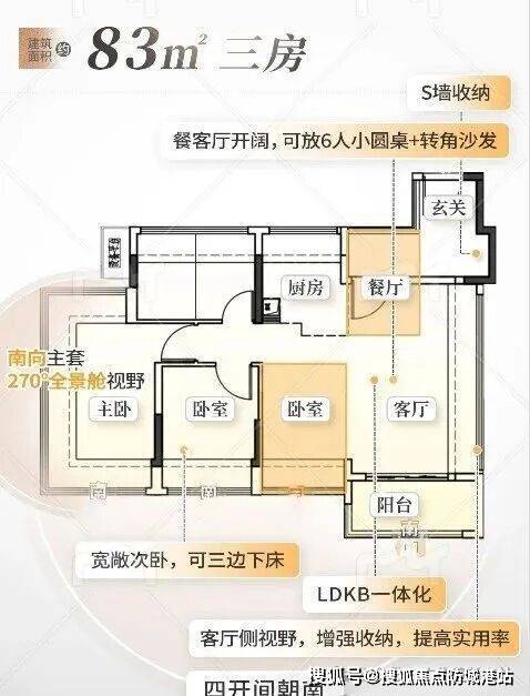 官方数据亮点:套内使用面积约72㎡,使用率约85.7%。实现小户型罕见的三开间朝南,主卧创新性采用270°转角飘窗,视野与采光倍增。通过优化管井位置,实现了“U”型明厨和干湿分离的次卫。