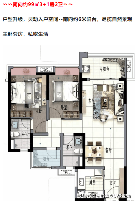 南向约99㎡3+1房2卫:户型升级,灵动入户空间,南向约6米阳台,尽揽自然景观;主卧套房设计,私密生活。