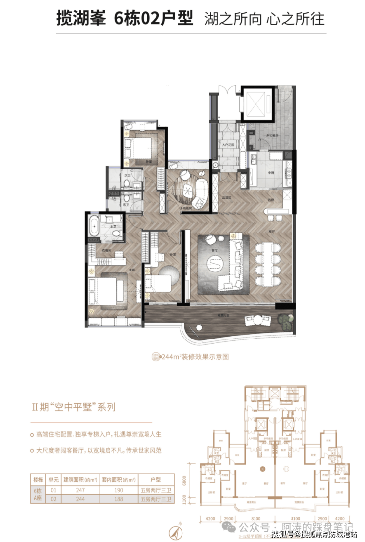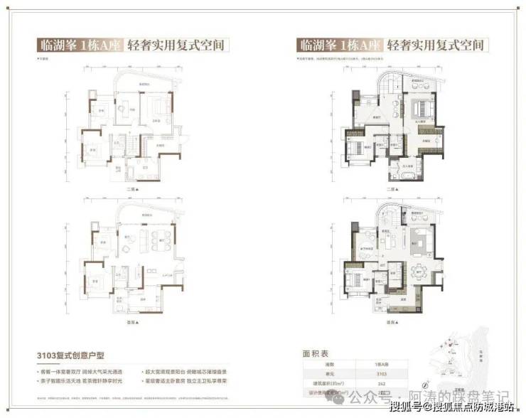 项目在售户型丰富,涵盖 247-438㎡湖居平层、187-438㎡创意复式,满足高端改善家庭多元居住需求。平层 247㎡均价 3.1 万元 /㎡,顶层复式 187-826㎡总价 383 万起,户型设计兼具实用性与舒适性。创意复式户型包括 238㎡创意双钥匙多功能轻奢顶复、187㎡城央天际创意双钥匙顶复(270° 环幕瞰景)、438㎡空中墅境复式迭代之作等,满足业主对居住空间的极致追求。平层户型设计方正,南北通透,多开间朝南,湖景视野开阔,空间利用率高,适配三代同堂、二孩家庭等改善型居住需求。复式户型采用创意双钥匙设计,多功能空间布局,可实现 “一层自住、一层出租” 的灵活使用方式,提升空间利用效率,满足高端改善家庭多元化居住需求。