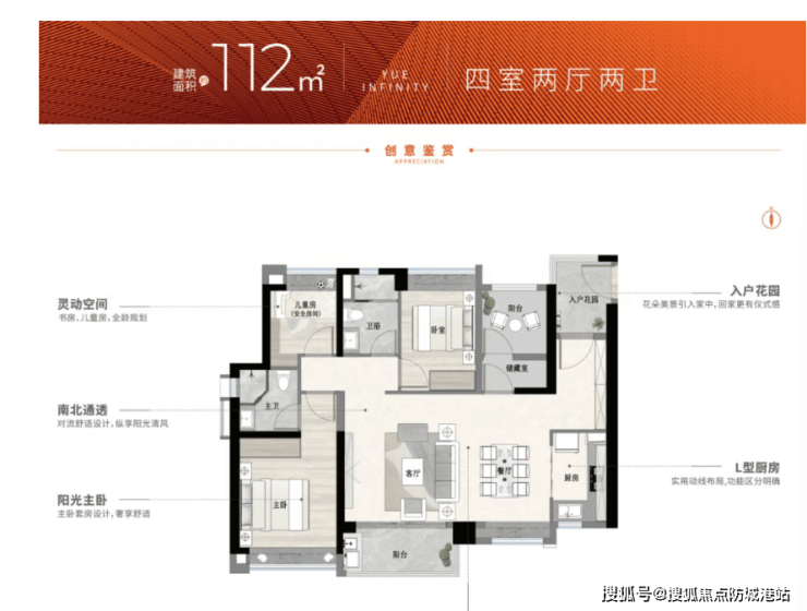 106-112㎡四房两厅两卫:改善王牌,横厅设计,270° 转角阳台,四开间朝南,主卧套房,LDKG 一体化布局,得房率约 85%,总价 290 万起,适配三代同堂。