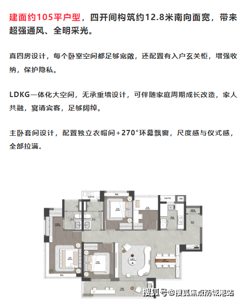 项目主打建面约 84-128㎡南向三至四房,以 “120%+ 使用率 + 全南向布局 + LDKB 一体化” 为设计核心,适配刚需到改善的多元需求。建面 84㎡小三房采用 “三开间朝南 + 双卫” 设计,客厅面宽约 3.6 米,配备独立阳台与全景飘窗,空间紧凑实用,满足三口之家刚需需求,使用率超 120%。建面 102㎡四房为 “飞机户型”,四开间朝南,南向采光面达 10.8 米,LDKB 一体化设计让会客空间更开阔,户型外围环绕花池与飘窗,赠送面积大,主卧配备独立衣帽间,适配改善家庭。建面 115㎡四房实现 “南北对流 + 双阳台”,南向宽阳台搭配花池,北向餐厅设花池可做餐边柜,形成空气对流;主卧为 L 型花池设计,景观面大且不占用室内空间,使用率达 125%。建面 127㎡四房为 “双阳台南北对流”,超宽客厅与阳台尺度感强,四开间朝南,适合多代同堂的终极改善需求。加推的 3 栋 108-123㎡户型,作为热门户型的优化版本,进一步提升空间利用率与居住舒适度。