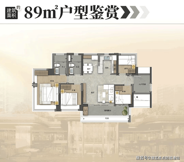 建面约89㎡五空间两厅两卫:采用横厅设计,实现南北对流,通风采光效果极佳。餐厅配备飘窗,主套采用三面环幕采光设计,全屋采光无死角,让每个空间都能享受充足日照。户型布局合理,动静分区明确,既能满足家庭欢聚的需求,又能保障个人隐私,适合追求居住品质的刚改家庭。