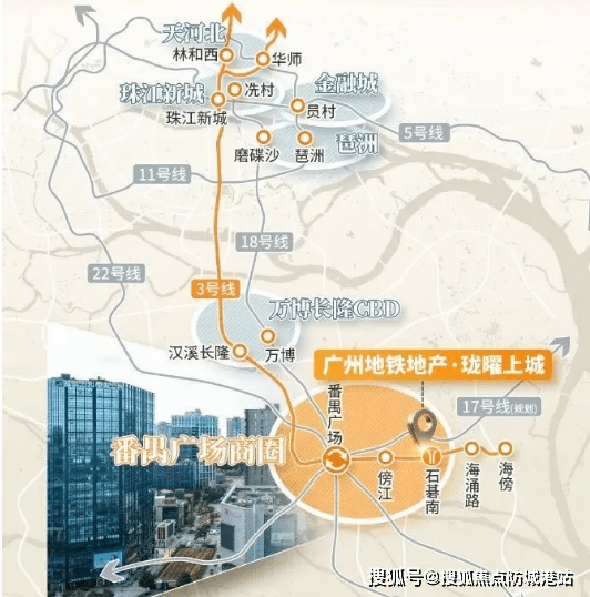 地铁3号线作为广州最繁忙的地铁线路之一,日均客流量约200万人次,串联天河北、珠江新城、长隆万博、番禺广场五大核心商圈,以及白云国际机场等重要枢纽。从项目出发,2站可达番禺广场,无缝对接18/22号线,实现3站直达万博CBD,4站抵达广州南站、琶洲CBD,5站直达珠江新城,半小时即可连接市中心核心区域。