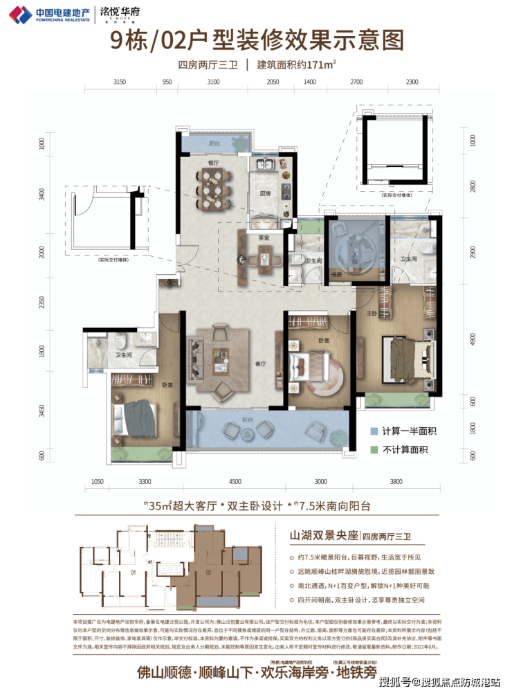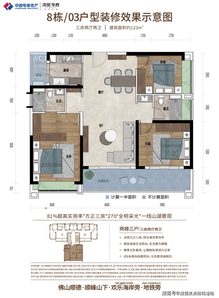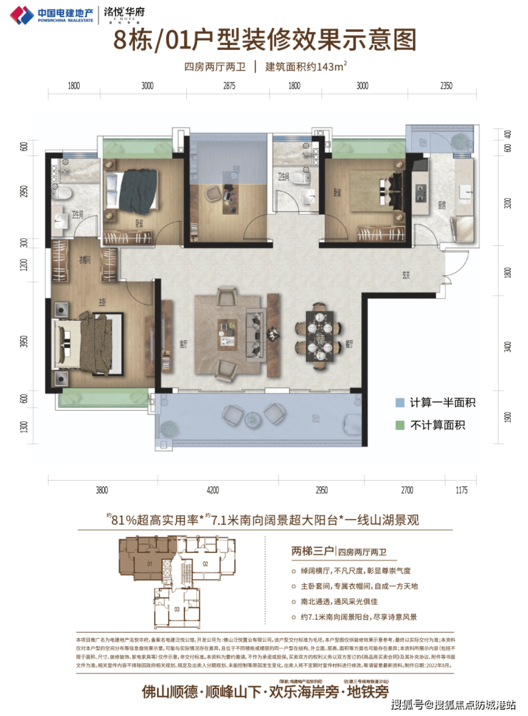 洺悦华府主推建面约123-171㎡的三四房户型,两梯两户或两梯三户设计,板式结构保证了每户的私密性和通风采光效果。南北对流,双阳台设计,部分户型配备有顺德最大的8m大阳台,使得每一户都拥有极致的视野享受。每户赠送面积达到15-20平方米,使用率高达83%以上。