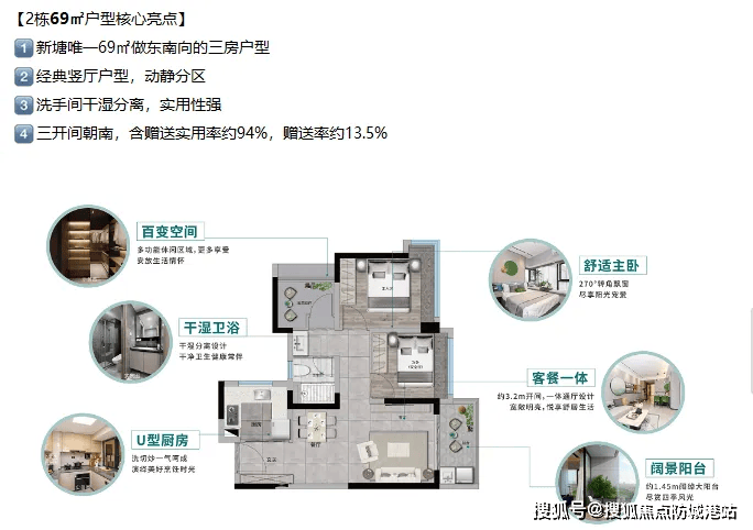69㎡户型(三房):东南向三房设计,经典竖厅布局,动静分区合理,实用性强。含赠送实用率约94%,赠送率约13.5%。