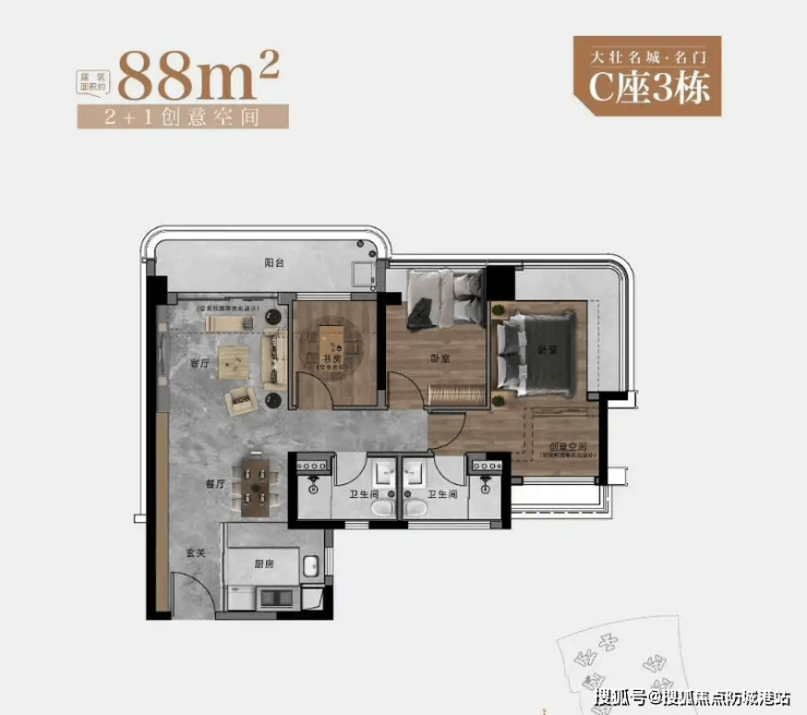 88㎡户型:刚需首选,紧凑实用:该户型为两房设计,朝西北方向,配备约5.7M巨幕阳台+270°环幕瞰景主卧,LDKB一体化设计,空间利用率高。