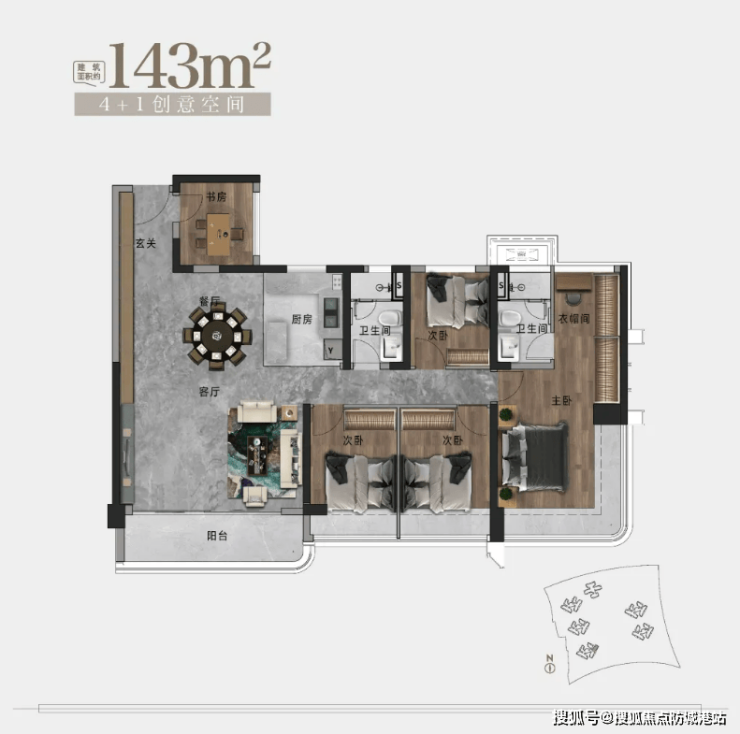 143㎡户型:高端改善,品质之选:该户型为四房两厅两卫,南向宽景4开间设计,配备约36.5M环幕采光面+270°环幕瞰景主卧,多元化功能阳台,尽显品质感。