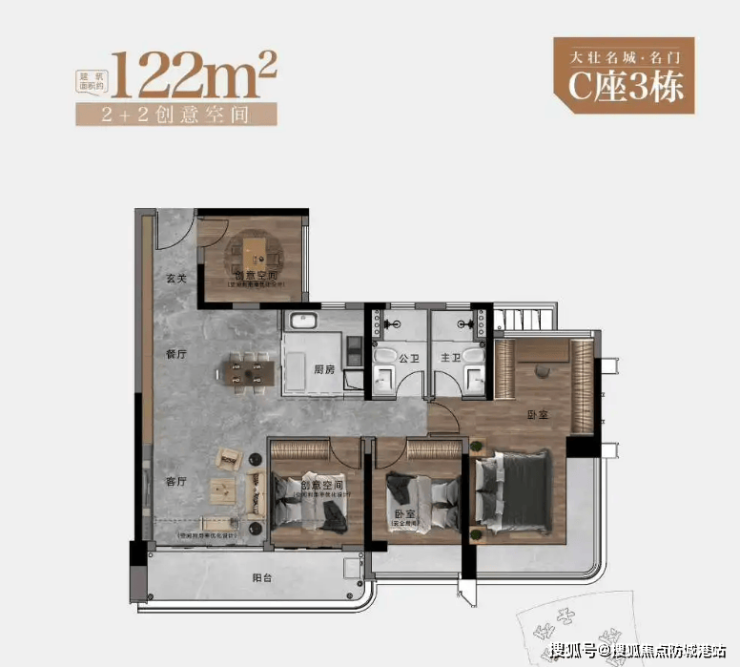 122㎡户型:改善优选,空间充裕:该户型为三房两厅两卫,朝东南方向,配备约6.6M南向景观阳台+270°环幕瞰景主卧,多元化功能阳台,实用性强。