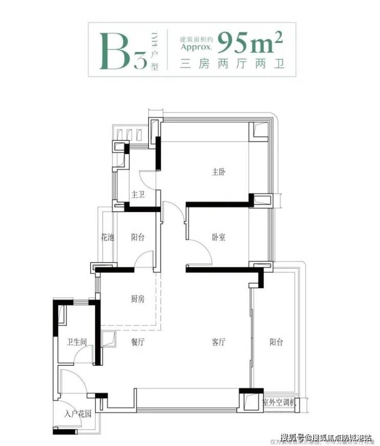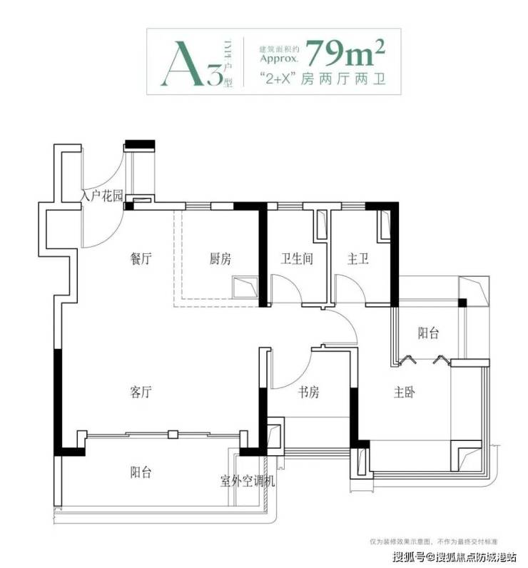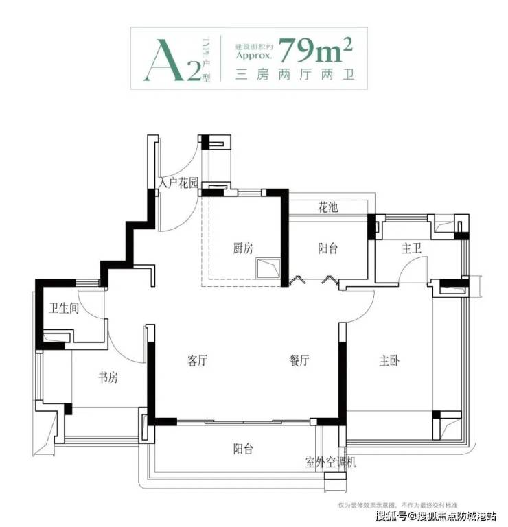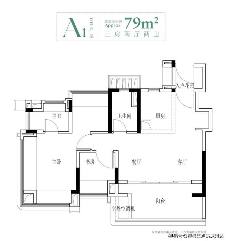 79平三个户型三条梯腿,A1(1#03)和A2(1#01)都是横厅的三房两卫,有独立入户花园和5.3米的宽景阳台。