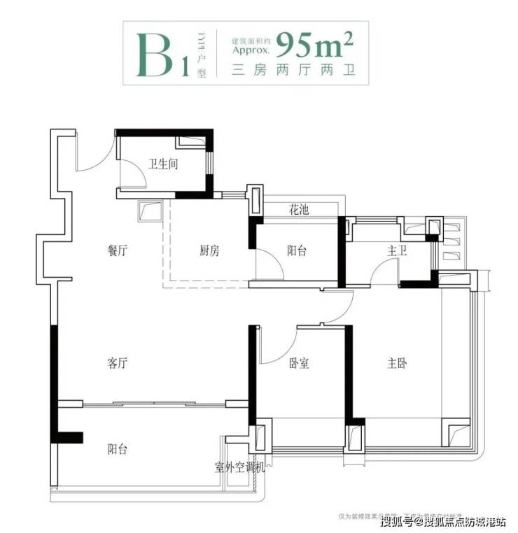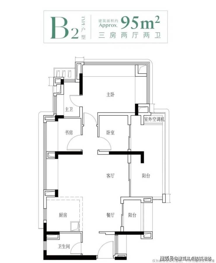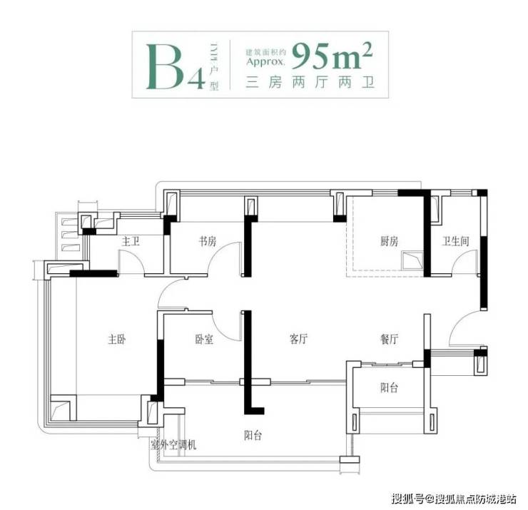 95平有四个户型五条梯腿,3+1房,B2(2#04)和B4(1#04)的四房空间区分更好,传统竖厅。