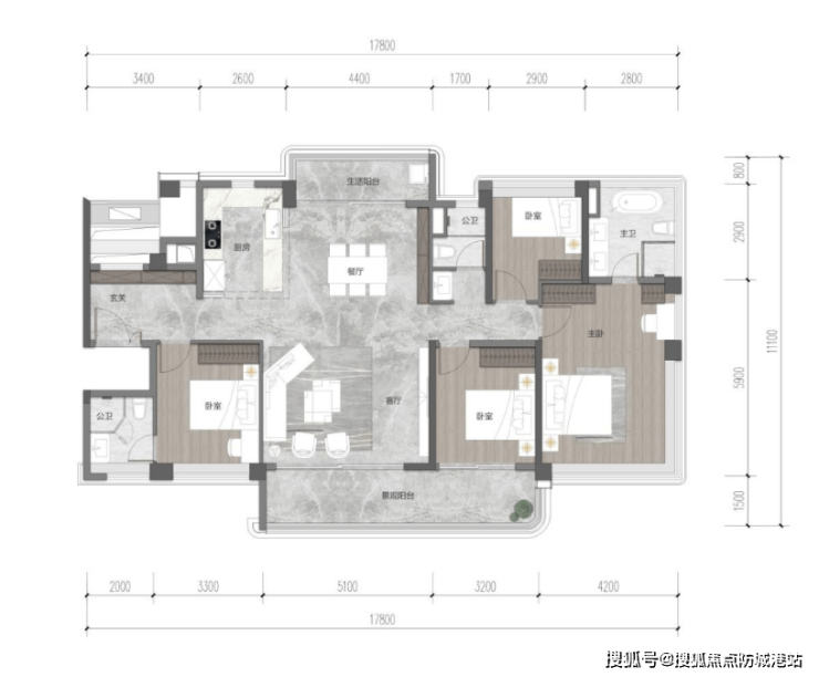 客厅宽敞明亮,连接景观阳台,采光充足,通风效果好,能容纳家人聚会、朋友招待等多种场景;四个房间布局合理,空间宽敞,每个房间都能保证充足的采光,避免了暗房的情况。主卧配备独立卫生间和衣帽间,私密性与舒适度兼顾,能满足业主对品质生活的追求;次卧空间宽敞,可作为老人房或儿童房,使用灵活。