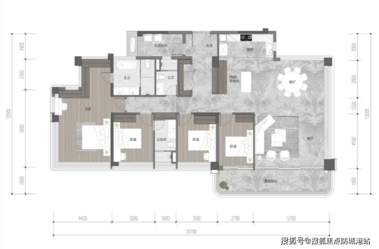 主卧套房尺度开阔,配备独立衣帽间、双台盆卫浴和270°环幕飘窗,私密性与舒适度兼顾,270°环幕飘窗能让业主全方位欣赏江景,享受极致的景观体验;次卧均为套房设计,配备独立卫生间,空间宽敞,能满足家人的私密性需求;此外,户型还设计有独立书房和儿童游乐区,兼顾办公、学习和儿童娱乐需求,满足高净值家庭的多元化居住需求。