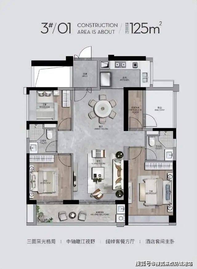 主力户型建面约126平方米的四房两厅两卫产品,采用了LDK(客餐厨)一体化设计理念。在该户型中,客厅开间达到约4.5米,连接着进深较大的景观阳台,使得南向江景能够最大程度地引入室内。厨房采用U型布局,操作台面充裕,且与餐厅之间无明显隔断,形成了流畅的动线,方便家庭成员在烹饪与用餐时的互动交流。主卧套房配备了独立卫生间与步入式衣帽间,保证了居住者的私密性与舒适度;次卧与书房的空间尺度也经过精细化考量,既能满足多代同堂的居住需求,也能灵活改造为儿童房或居家办公区。这种空间布局摒弃了传统豪宅中常见的冗余装饰,转而追求实际使用率的最大化,让每一平方米都服务于真实的生活场景。