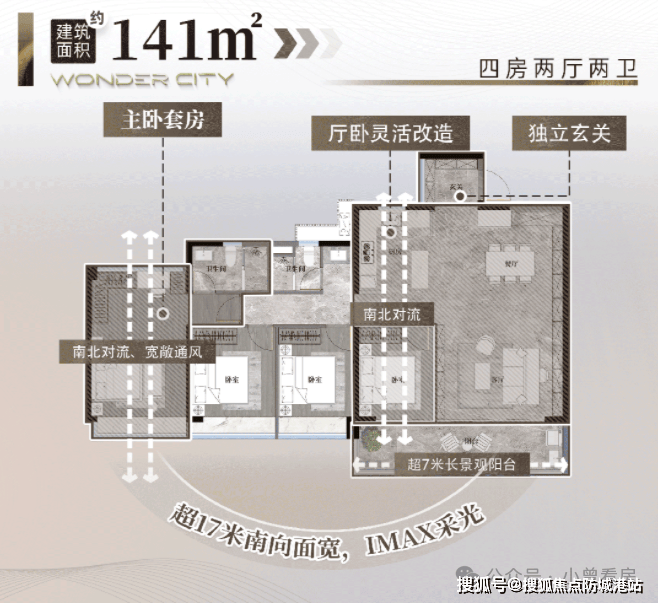 约128平方米四房两厅两卫:此户型堪称“轻奢改善旗舰”。它拥有约8.65米的IMAX级观景阳台,直面中心园林与别墅区景观,视野无遮挡。约5.05米开间的客餐厅,营造出阔绰的社交与家庭聚会空间。南北通透的对流设计,让清风穿堂而过。主卧开间达4米,配备步入式衣帽间和奢华三分离卫生间,居住尊严感拉满。这个户型适合追求高品质居住体验、注重景观和尺度的再改家庭或高端商务人士。