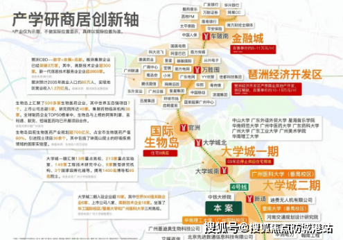 项目所在的国际创新城板块被称为“大学城2.0版本”,拥有包括暨南大学和广州医学院在内的多所高校,以及丰富的产业孵化基地和发展规划。整个创新城在空间结构上形成了一核两翼的布局,包括北翼的生物岛、核心的大学城和南翼的南岸起步区等区域。