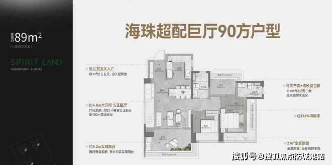 建面约89㎡:三房两厅两卫,内外双玄关,LDKG+X一体化设计。