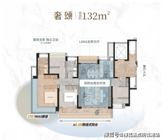 建面约132㎡户型:为高端改善户型,四房两卫格局,空间奢阔通透,彰显品质生活。奢厅入户设计,无触直达宅门,提升归家仪式感与私密性。LDKG大方厅设计,空间开阔,搭配洄游厨房空间,中西两厨交融,满足业主多元化烹饪需求与社交需求。约8.3米跑道式景观阳台,视野开阔,可俯瞰园林全景,揽境无限。