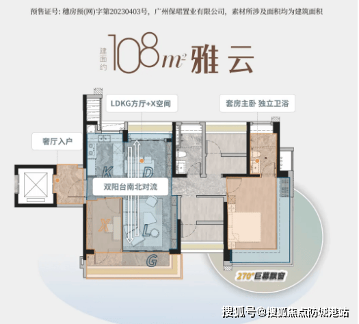 建面约108㎡户型:定位改善型户型,同样为四房两卫设计,在空间舒适度与功能性上进一步提升。奢厅入户搭配脏净分离设计,勾勒清晰生活秩序,避免外界灰尘带入室内。采用LDKG+X一体化设计,将客厅、餐厅、厨房、阳台及灵活空间融合,解锁家人互动新模式,增进家庭情感交流。