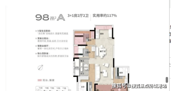 约98平户型:可改造为3+1房2厅2卫格局,适合改善家庭一步到位。该户型布局合理,动静分区清晰,主卧自带大飘窗,采光和通风效果极佳,闲暇时可坐在飘窗上观景、休憩;客卧与主阳台直接连通,延伸了室内空间,同时保证了客卧的采光和通风,实用性拉满;厨房采用U型布局,优化取切洗炒的动线,避免折返,操作便捷;卫生间干湿分离设计,保持室内整洁干燥,提升居住舒适度。