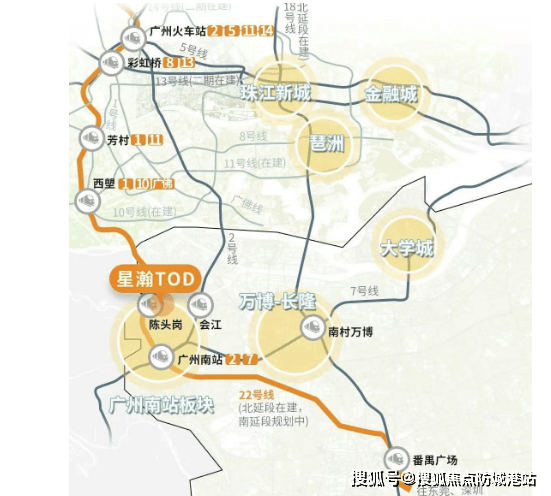 越秀星瀚TOD的南区楼下就是地铁22号线陈头岗站,仅需步行几分钟即可到达。通过这条线路,可以快速抵达广州南站、番禺广场等地,并无缝对接多条地铁线,极大地方便了居民的出行。此外,自驾出行也十分便利,出门即是南大干线,周边还有东新高速以及在建的东晓南放射线,使得前往万博、大学城或海珠西都变得异常轻松。