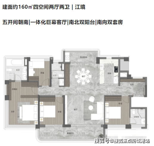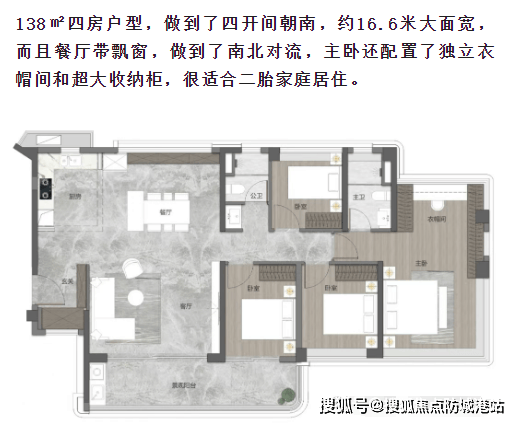 138平方米四房两厅两卫:四开间朝南,约16.6米大面宽,餐厅带飘窗,南北对流,主卧配有独立衣帽间和超大收纳柜。