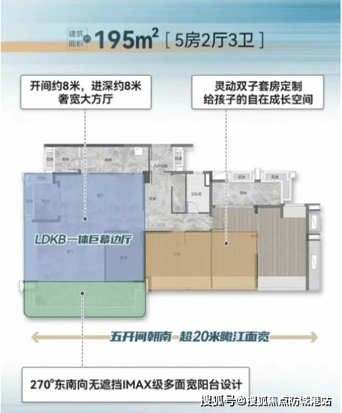195平方米四房两厅两卫:阳台长度约8米,LDK客餐厅面积达70平方米以上,两侧观江面总长超过16米,空间感堪比酒店的江景宴会厅。