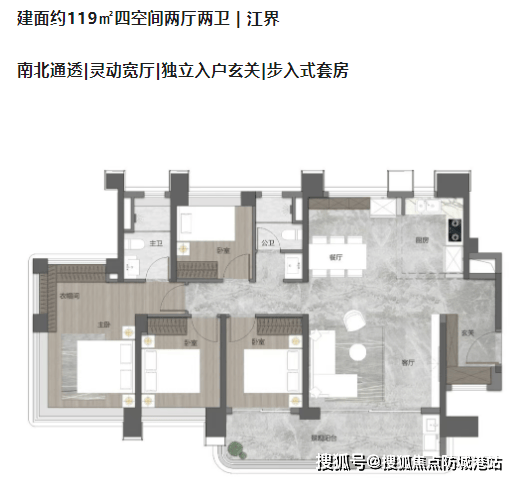 119平方米四房两厅两卫:南北通透,灵动宽厅设计,独立入户玄关,步入式套房配置。