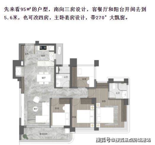 95平方米三房两厅两卫:南向三房设计,客餐厅和阳台开间达到5.6米,主卧套房设计带有270度大飘窗。
