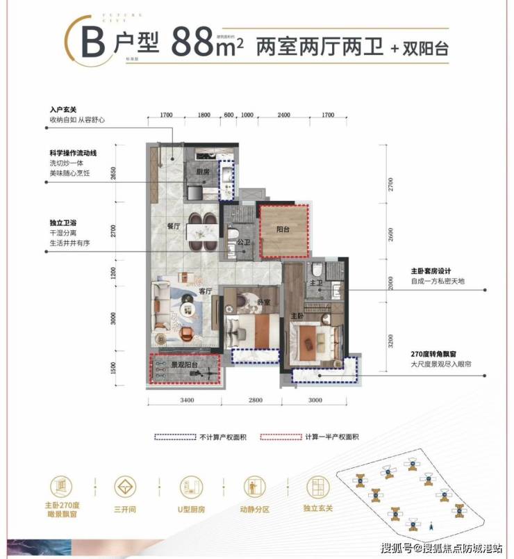 项目所有户型均采用方正布局,南北通透,采光通风极佳,户型层高为3米,比常规户型高出不少,有效提升了室内空间的开阔感和舒适度,避免了压抑感。同时,户型设计注重私密性和实用性,设有独立玄关,提升房型结构与隐私性,入户先见公共区域,主人居住空间相对独立,动静分区明确,公共区域(客厅、餐厅、厨房)与私密区域(卧室、卫生间)有效分离,既保证了家人的休息质量,又不影响日常活动和接待客人。此外,户型设计还融入了人性化细节,比如U型厨房、观景阳台、独立卫生间等,全方位提升居住的舒适度和便利性。