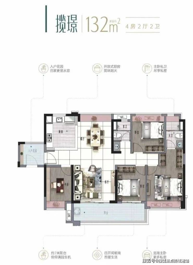 奢华大平层196㎡3+2房3卫:四开间朝南,南北对流,景观大阳台连通次卧,三代同堂宜居。