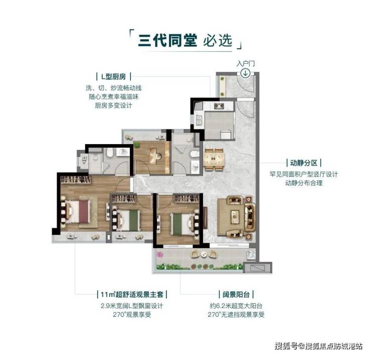 超百米观景视野:新式蝶式布局,户户入户花园设计,对流通风无遮挡,尽享360°环幕视野。