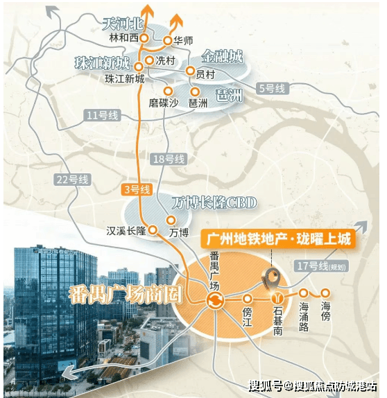 地铁地产珑曜上城坐落于番禺亚运城板块,紧邻亚运大道,地理位置优越。作为轨道站场上盖项目,它将交通优势发挥得淋漓尽致,小区距离地铁3号线石碁南站约700米,步行仅需10分钟,这样的距离在同区域内颇具竞争力。通过地铁3号线,可便捷直达珠江新城等城市核心区域,为居民的日常出行和工作通勤提供了极大便利。