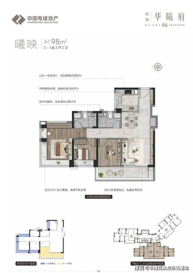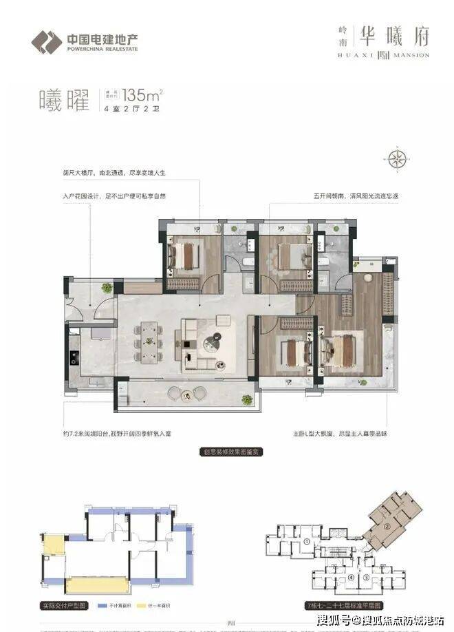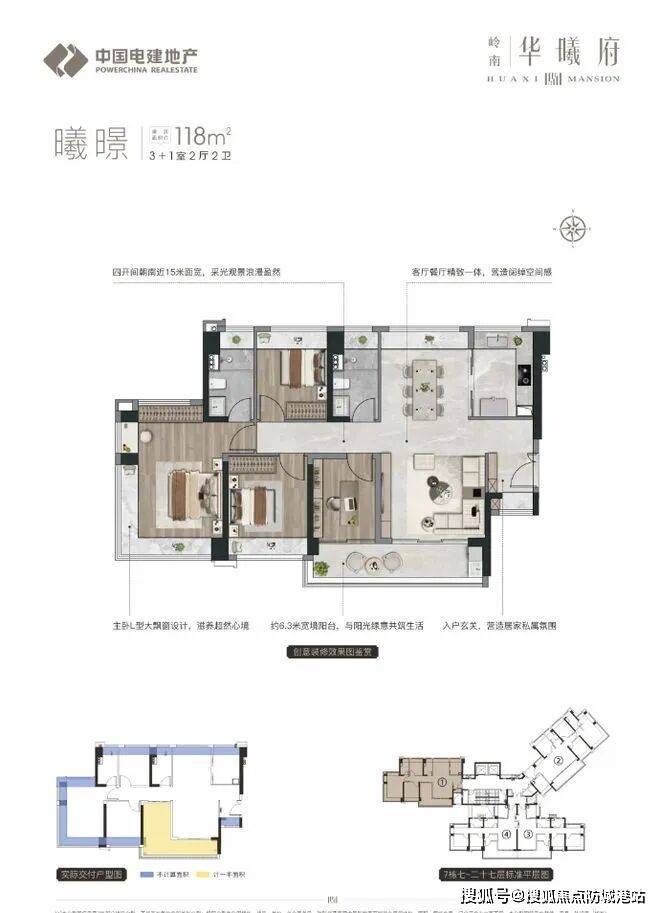 中国电建・岭南华曦府建筑面积约15.8万㎡,占地面积约4.5万㎡,容积率约2.6,绿化率约30%。楼栋数共9栋,梯户比为2梯4户,总户数达到1048户,停车位共计1048席。首推户型包括建面约98㎡、118㎡、135㎡的生态华宅,交房标准为精装交付。