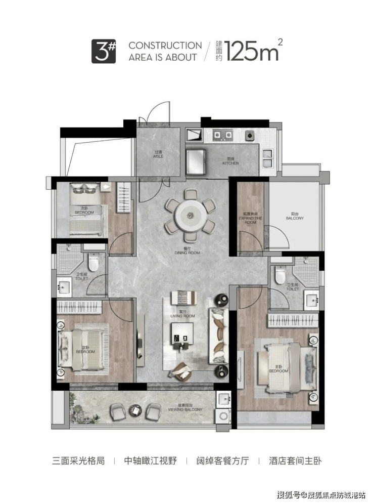 中铁建西派澜岸主打改善型产品,户型涵盖 105㎡三房、125㎡四房、140㎡四房、253㎡大平层等多种户型,可满足不同家庭结构的改善需求。所有户型均采用南北通透、全明设计,搭配超大观景阳台、全景飘窗等设计元素,最大化提升空间采光与通风效果,同时兼顾景观视野与实用性。