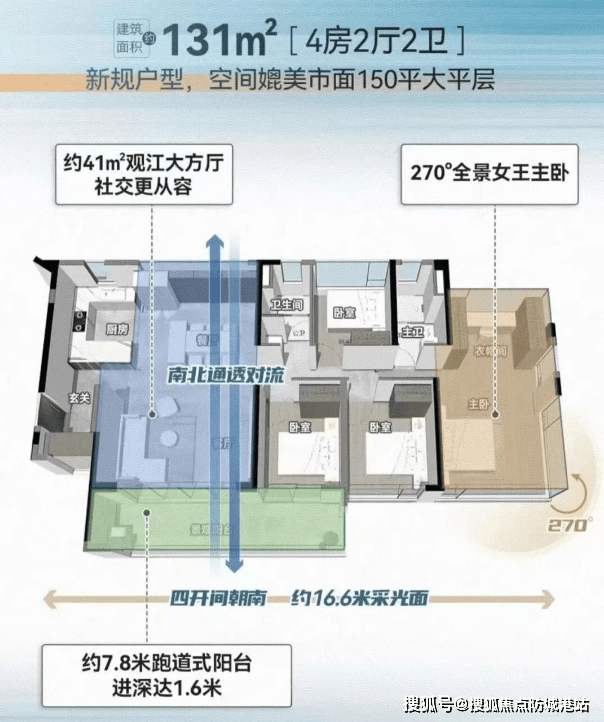 南北对流,四开间朝南,采光面约 16.6 米,拥有园景 + 江景双重景观面,兼顾景观与采光,为业主带来高品质居住体验。