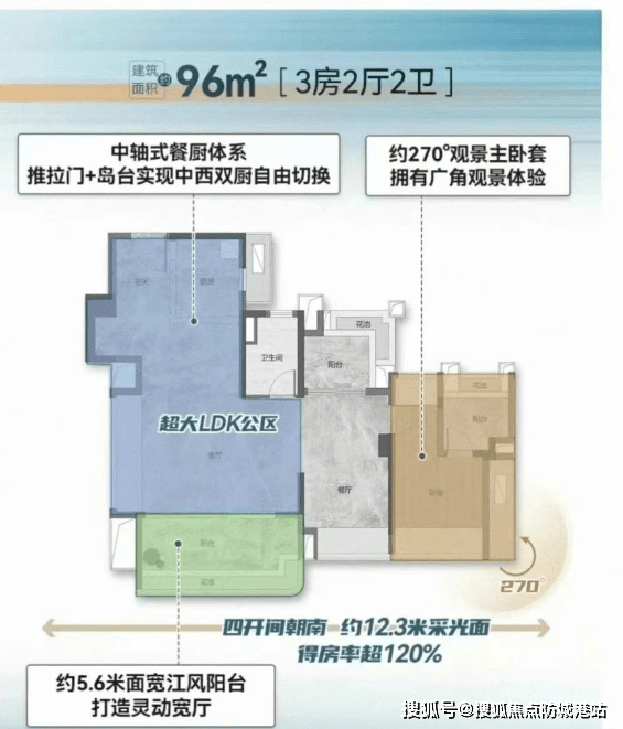 南向看江景,主卧配备 270° 环幕大飘窗,全面放大采光与景观视野,在有限空间内实现舒适与享受的完美结合,满足刚需购房者对江景房的向往。