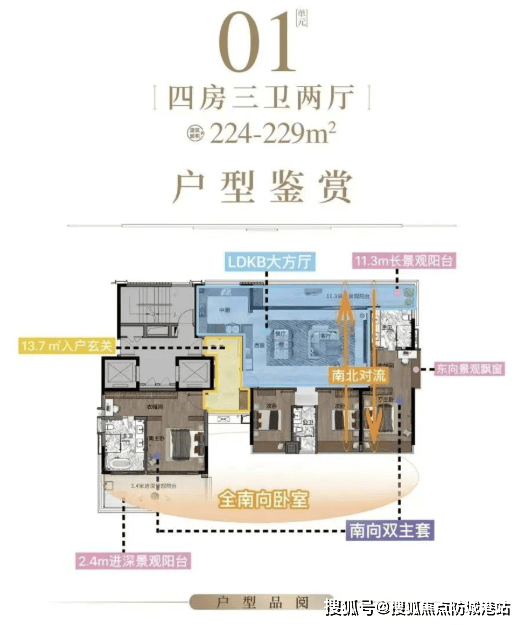 建面约224-229㎡四房大平层:总价约2,800万元起,板式设计,四开间朝南,超大景观阳台