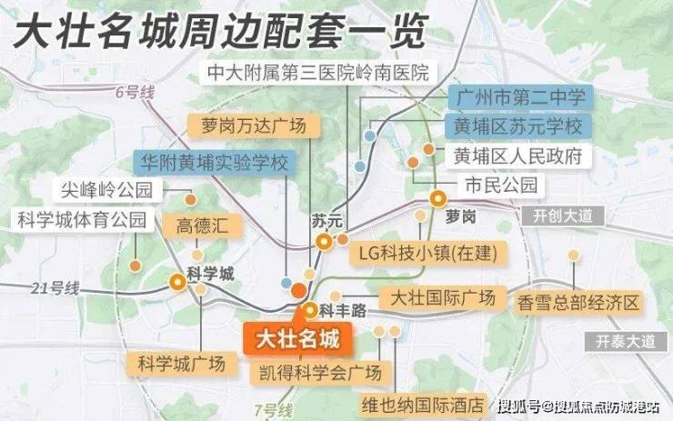 项目距离地铁6号线暹岗站步行约800米,距离7号线科丰路站步行约900米,距离6/21号线苏元站步行约1.8公里。三线交汇的地铁大盘在科学城乃至整个广州都较为少见,大大提升了项目的交通便利性。