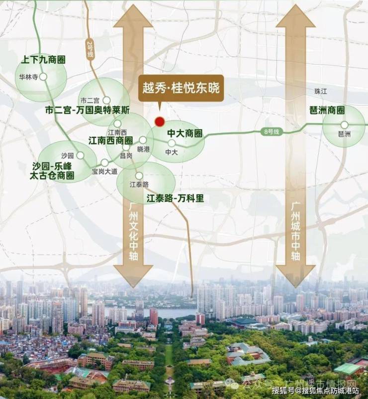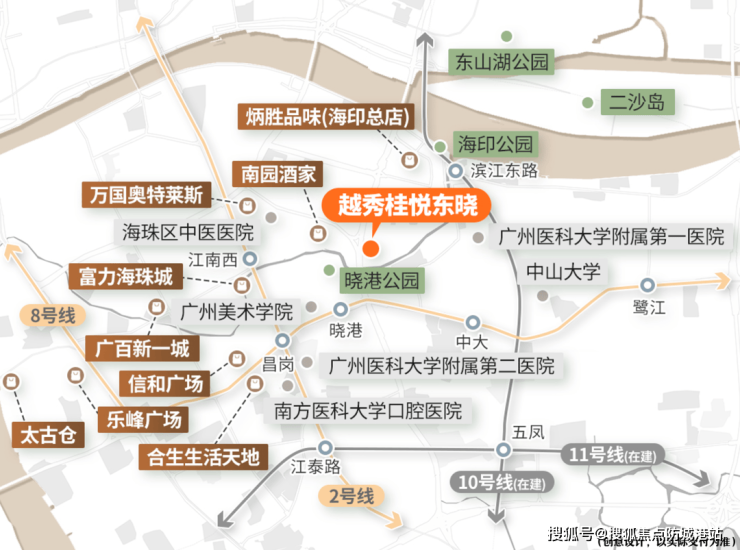 项目距离地铁8号线晓港地铁站仅0.6km,8号线可直达琶洲、客村等商务圈,一站到昌岗能换乘2号线,方便到达南站、白云新城等地,三站到客村换乘3号线可到珠江新城、体育西路,实现40分钟内通勤。项目门口就有公交站,线路众多,覆盖越秀、天河、荔湾、白云等区域。自驾也很便利,过海印桥可达越秀东湖,穿过二沙岛可直达珠江新城,一条新滘西路可直达琶洲。
