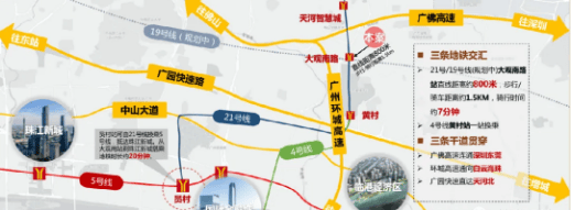 城轨方面,广佛东环线及穗莞深城轨环绕,广佛东环线从广州南站出发,可直接连通白云机场,板块内设有智慧城站,未来乘坐城轨可快速通达广州南站及白云机场;穗莞深城轨广州东站至深圳机场已通车,其设置的奥体中心站(天河东站,即将启用)直线距离本项目约1500米,未来往返深圳、东莞等地将更加便捷。