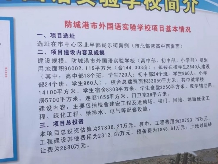 据悉,防城港市外国语实验学校项目位于市中心区北半部乐民街南侧(市北部湾高中西南面)。总投资约27836.27万元,占地面积144亩,拟按在校学生2640人建设,包括高中部、初中部、小学部。主要建设内容包括校舍建安工程及运动场、校门、围墙、地面硬化工程、绿化工程、给排水、电气等配套设施。项目预计2019年3月主体完工,2019年9月前交付使用,建成后将进一步完善海湾新区基础设施配套,全面提高行政中心区域教育水平,满足群众实际需求。