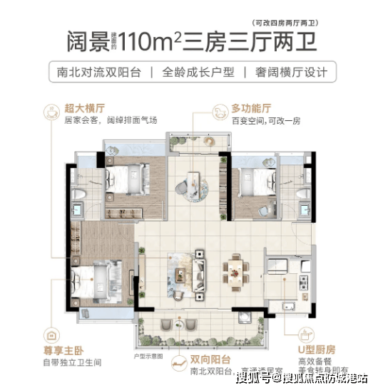 此外,项目还有少量110平四房两厅两卫现房尾货,主要分布在1-2栋的低楼层及高楼层,毛坯房260万起,带装修房320万起,LDK一体化设计,客餐厨阳台连通,南向面宽达10.2米,次卧面积均在9㎡以上,空间宽敞,适配三口之家或改善型家庭,满足业主对居住空间的更高需求。
