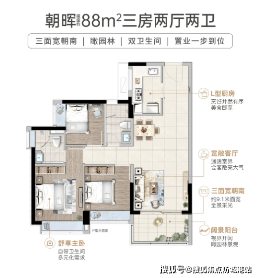 现房尾货方面,主要集中在3栋,该楼栋共46层高,3梯6户设计,保障了业主的出行效率,避免了高峰期等待电梯的烦恼。主要户型为88平毛坯三房两卫,总价199万任选,户型设计紧凑合理,空间利用率高,三房两卫的布局,能够满足三口之家的居住需求,主卧带独立卫浴,保障了业主的隐私,客厅连接阳台,采光通风优良,让室内空间更加明亮通透,毛坯交付可让业主根据自己的喜好进行装修设计,打造专属自己的居住空间。